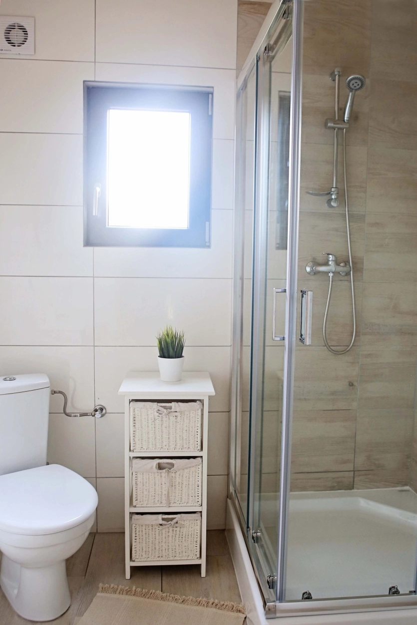 Powierzchnia całkowita każdego domku to 65 m2. Każdy domek posiada na piętrze 2 osobne zamykane sypialnie. Przed każdym domkiem znajduje się zadaszony taras a na wyposażeniu jest grill.